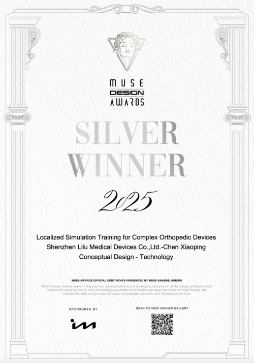 近日,2025年缪斯设计奖(Muse Design Awards)获奖名单正式揭晓,深圳市礼路医疗器械有限公司首席技术战略官陈小平女士主导研发的“复杂骨科医疗器械本地化临床实训模拟教学系统”凭借在技术创新与用户体验上的卓越表现,成功斩获银奖,成为本次评选中骨科医疗器械领域的亮眼成果。
