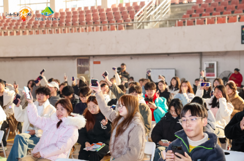 文旅市集“好吃好逛”。在场边设立的八大文旅市集摊位是另一处人气爆点。各展位前挤满了试吃特产、收集攻略、欣赏文创、扫码互动的学生。庐山的茶饼、浔阳的文创书签等成为热门礼品,不少学生边品尝边咨询寒假旅游线路。“没想到在学校就能体验到这么地道的九江味道,我已经计划放假去庐山看雪了!”一名大二学生兴奋地说。